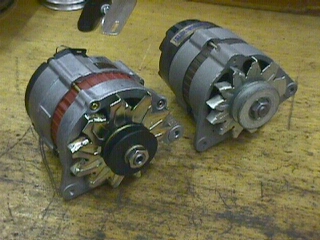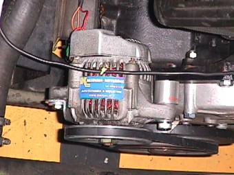 Voor de racers hebben we nu heel kleine Nippon Denso generators toegepast, 45A, en iets zwaarder dan 2kg. Deze passen niet zonder meer, en zijn dus niet bruikbaar als vervanger voor een gewone auto. Hiervoor heb ik eerst een speciale beugel moeten ontwerpen waardoor hij nu bijna op de motorsteun zit, en de V-snaar nog maar 75cm lang is.